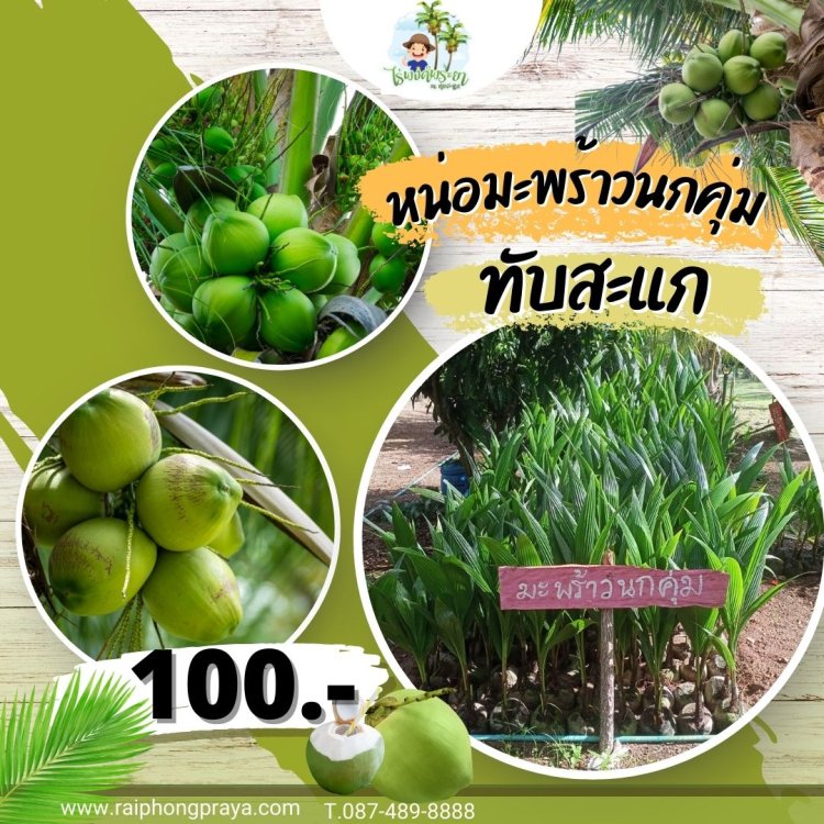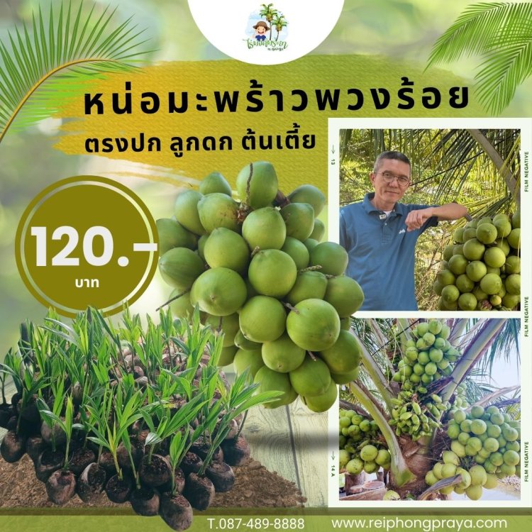 หน่อพันธุ์ต้นมะพร้าวพวงร้อยแท้ ต้นเตี้ยลูกดก น้ำเยอะเนื้อเยอะ ปลูกง่าย ออกลูกทุกเดือนตลอดปี