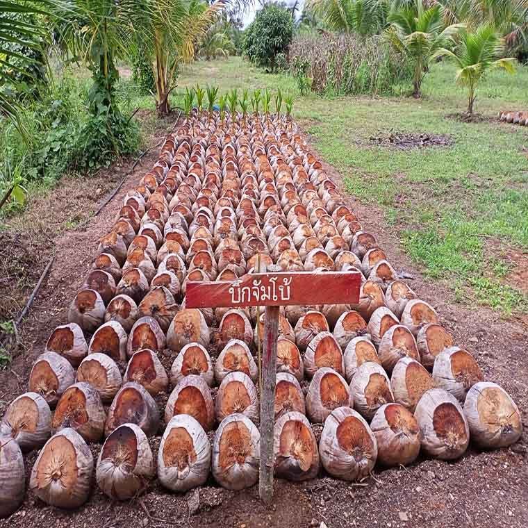 เมื่อเตรียมแปลงแล้วนำเอาผลมะพร้าวฝังลงในแปลงวางเรียงผลให้เกือบชิดกันเอาผลด้านที่ฝานเปลือกไว้วางขึ้นด้านบน