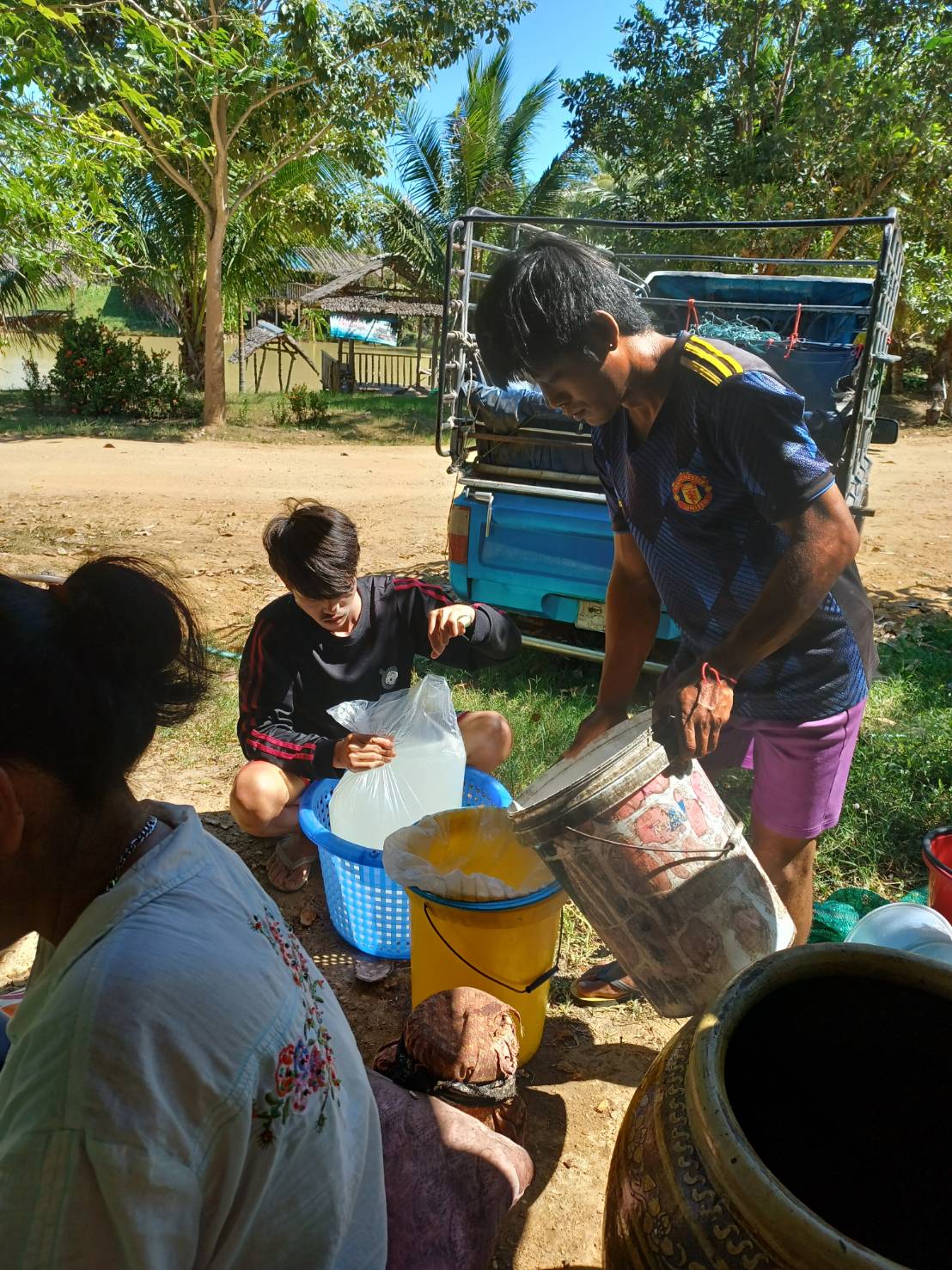 ขั้นตอนที่ 1 ในการทำมะพร้าวขาว หลังจากที่เราคัดแยกมะพร้าวไซร์สใหญ่ออกขายเป็นมะพร้าวลูกแล้ว เหลือแต่มะพร้าวไซร์สเล็กตกรุ่น เราจะนำมะพร้าวมาปอกเปลือกออก ตอกเอาน้ำออกเก็บไว้ เพื่อให้เหลือแต่กะลา